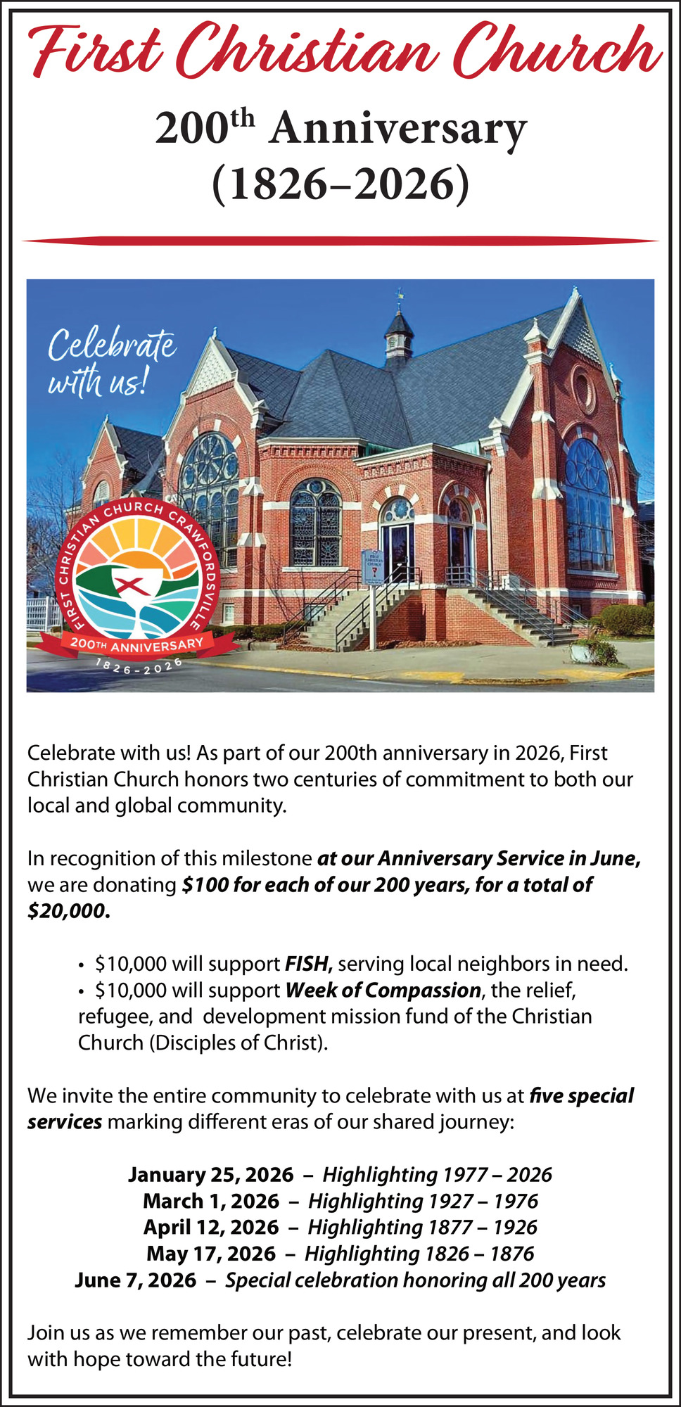 Jan 13, 2026. First Christian Church - Crawfordsville Church Ads from Journal Review