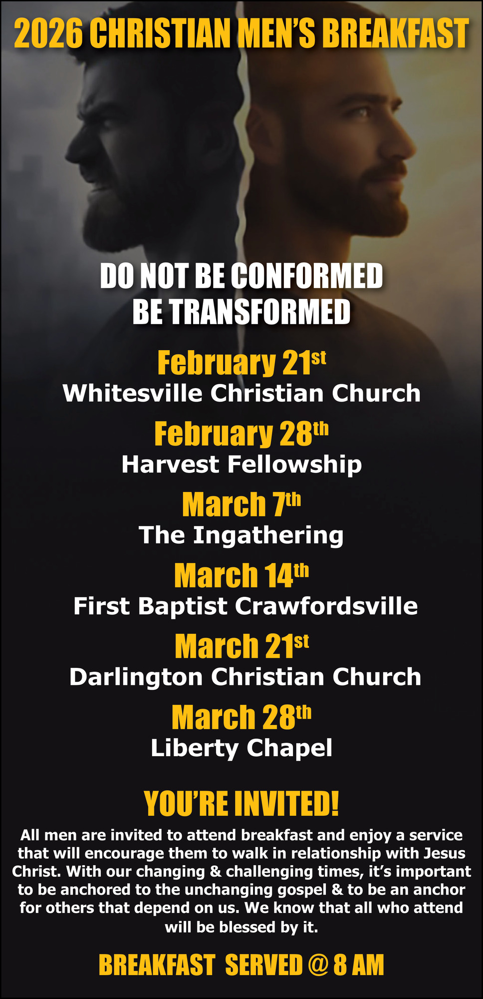 Ads for 2026 Christian Men's Breakfast in Crawfordsville, IN