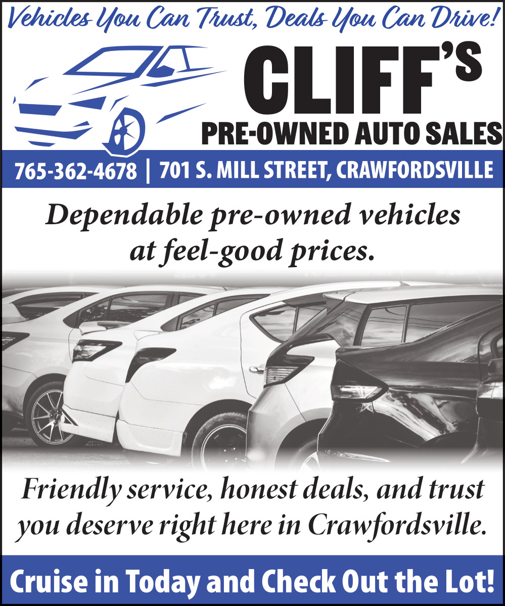 Ads for Cliff's Pre-Owned Auto Sales in Crawfordsville, IN